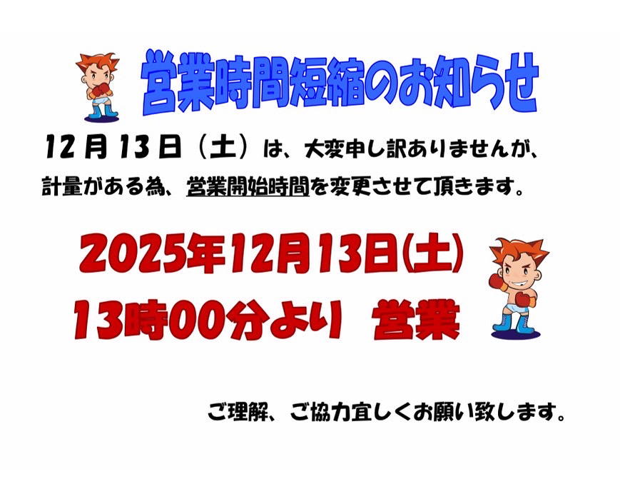 12/13(土)営業時間短縮のお知らせ